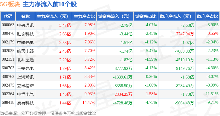 从资金流向上来看,当日5G板块主力资金净流出154.14亿元,游资资金净流入67.54亿元,散户资金净流入86.59亿元。5G板块个股资金流向见下表: