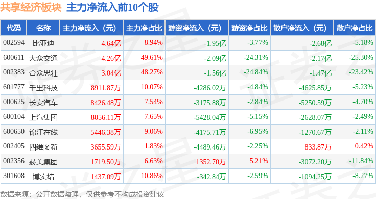 从资金流向上来看,当日共享经济板块主力资金净流入12.81亿元,游资资金净流出8.28亿元,散户资金净流出4.53亿元。共享经济板块个股资金流向见下表: