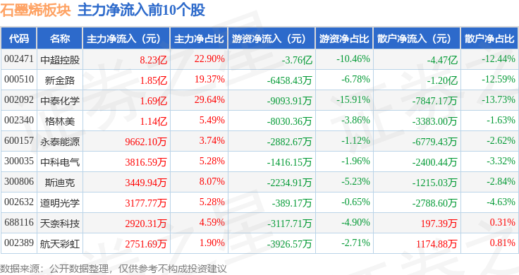 从资金流向上来看,当日石墨烯板块主力资金净流入4241.4万元,游资资金净流出4.65亿元,散户资金净流入4.22亿元。石墨烯板块个股资金流向见下表: