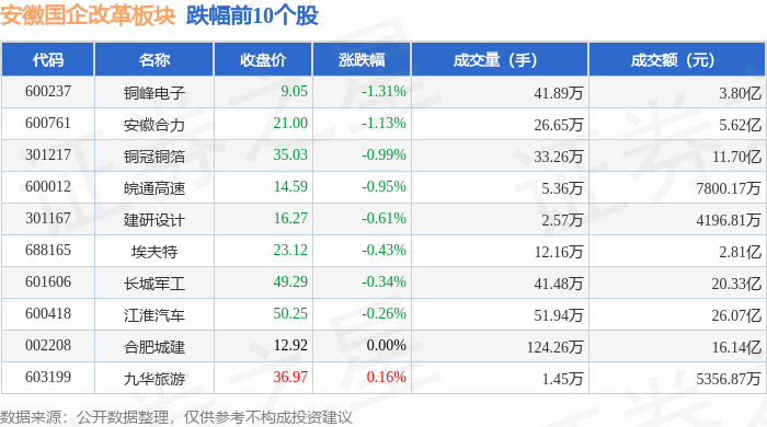 从资金流向上来看,当日安徽国企改革板块主力资金净流出3308.37万元,游资资金净流入1022.74万元,散户资金净流入2285.64万元。安徽国企改革板块个股资金流向见下表: