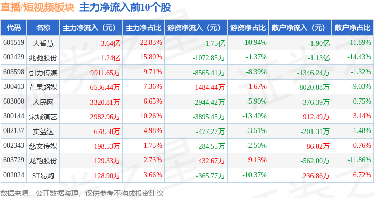 从资金流向上来看,当日直播/短视频板块主力资金净流出24.4亿元,游资资金净流入4989.22万元,散户资金净流入23.9亿元。直播/短视频板块个股资金流向见下表: