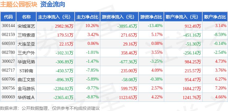 从资金流向上来看,当日主题公园板块主力资金净流出3220.98万元,游资资金净流出2013.23万元,散户资金净流入5234.21万元。主题公园板块个股资金流向见下表: