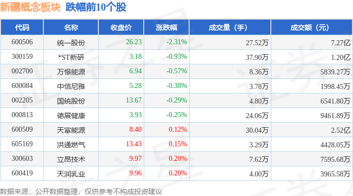 证券之星消息,1月6日新疆概念板块较上一交易日上涨2.79%,新疆天业领涨。当日上证指数报收于4083.67,上涨1.5%。深证成指报收于14022.55,上涨1.4%。新疆概念板块个股涨跌见下表: