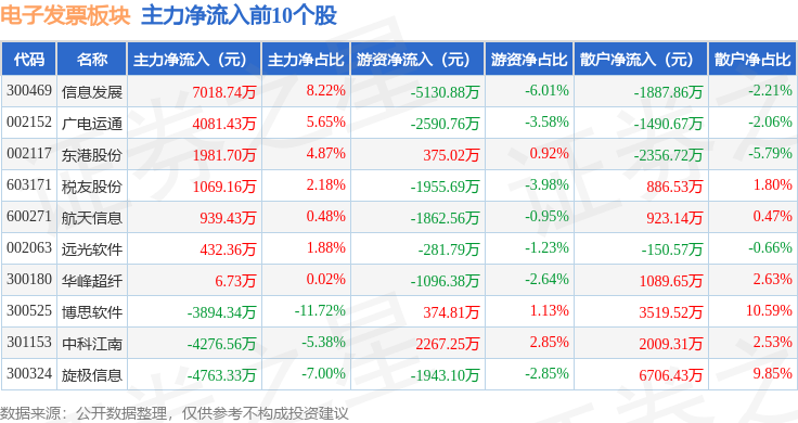 从资金流向上来看,当日电子发票板块主力资金净流出4.14亿元,游资资金净流出1.19亿元,散户资金净流入5.32亿元。电子发票板块个股资金流向见下表:
