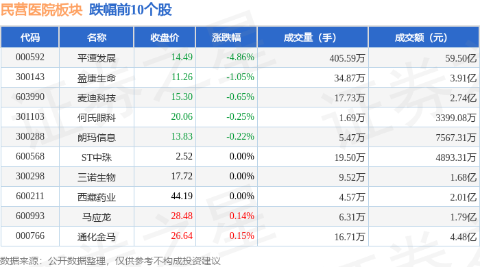 从资金流向上来看,当日民营医院板块主力资金净流出4.02亿元,游资资金净流出4.26亿元,散户资金净流入8.28亿元。民营医院板块个股资金流向见下表: