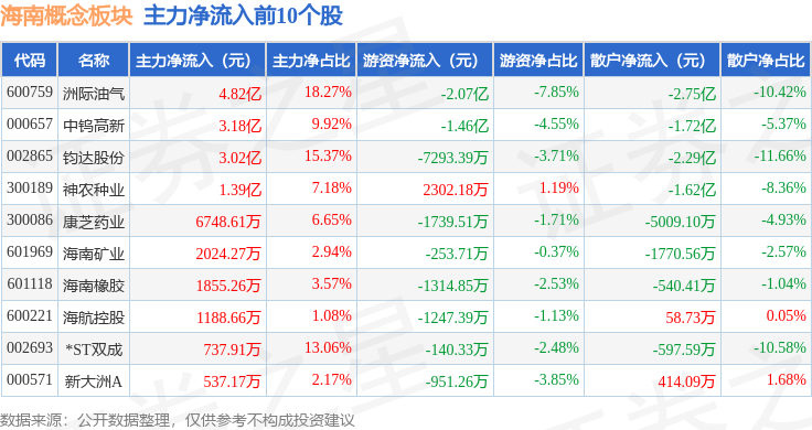 从资金流向上来看,当日海南概念板块主力资金净流入5.54亿元,游资资金净流出3.43亿元,散户资金净流出2.11亿元。海南概念板块个股资金流向见下表: