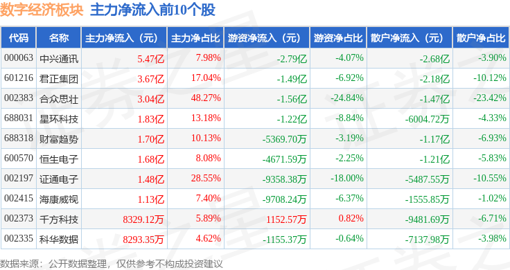 从资金流向上来看,当日数字经济板块主力资金净流出40.6亿元,游资资金净流出14.81亿元,散户资金净流入55.41亿元。数字经济板块个股资金流向见下表: