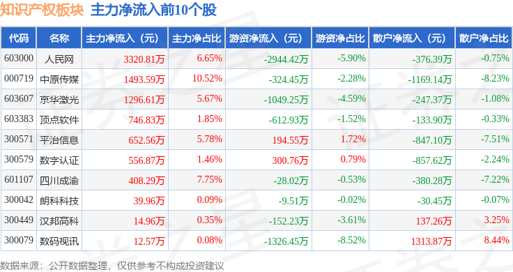 从资金流向上来看,当日知识产权板块主力资金净流出14.45亿元,游资资金净流入7746.05万元,散户资金净流入13.68亿元。知识产权板块个股资金流向见下表: