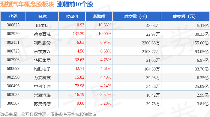 证券之星消息,1月6日理想汽车概念股板块较上一交易日上涨3.44%,阿尔特领涨。当日上证指数报收于4083.67,上涨1.5%。深证成指报收于14022.55,上涨1.4%。理想汽车概念股板块个股涨跌见下表:
