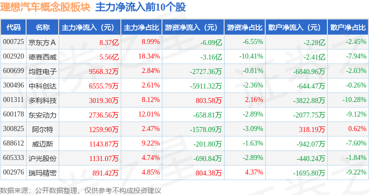 从资金流向上来看,当日理想汽车概念股板块主力资金净流入1.88亿元,游资资金净流出11.19亿元,散户资金净流入9.31亿元。理想汽车概念股板块个股资金流向见下表: