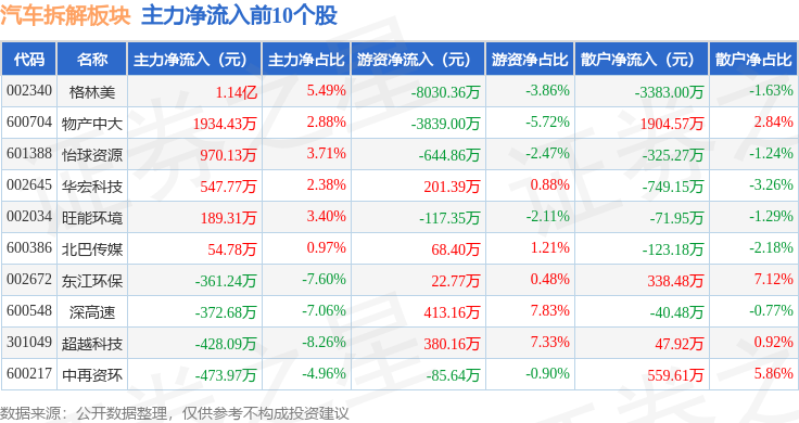 从资金流向上来看,当日汽车拆解板块主力资金净流入64.02万元,游资资金净流出1.69亿元,散户资金净流入1.68亿元。汽车拆解板块个股资金流向见下表: