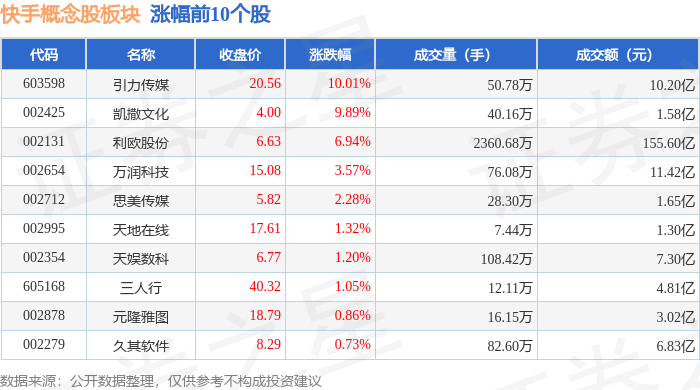 证券之星消息,1月6日快手概念股板块较上一交易日上涨0.21%,引力传媒领涨。当日上证指数报收于4083.67,上涨1.5%。深证成指报收于14022.55,上涨1.4%。快手概念股板块个股涨跌见下表: