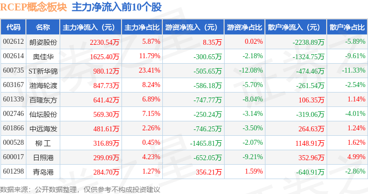 从资金流向上来看,当日RCEP概念板块主力资金净流出4227.77万元,游资资金净流出1.19亿元,散户资金净流入1.61亿元。RCEP概念板块个股资金流向见下表: