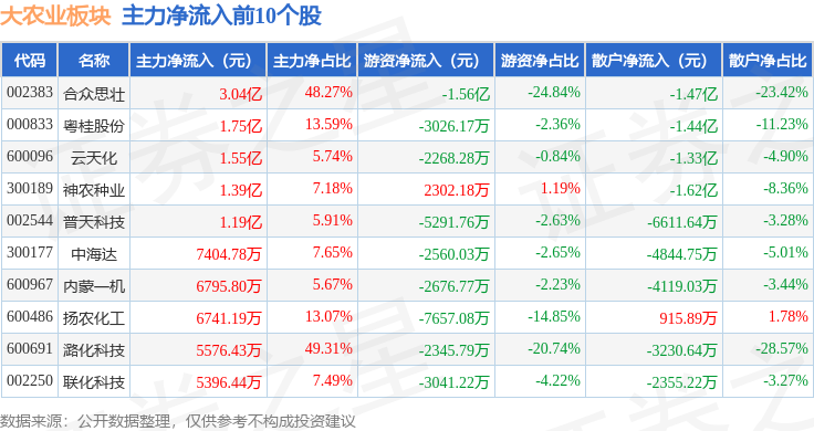 从资金流向上来看,当日大农业板块主力资金净流出8.6亿元,游资资金净流出1.22亿元,散户资金净流入9.82亿元。大农业板块个股资金流向见下表: