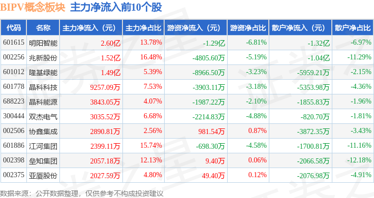 从资金流向上来看,当日BIPV概念板块主力资金净流入5.43亿元,游资资金净流出2.94亿元,散户资金净流出2.49亿元。BIPV概念板块个股资金流向见下表: