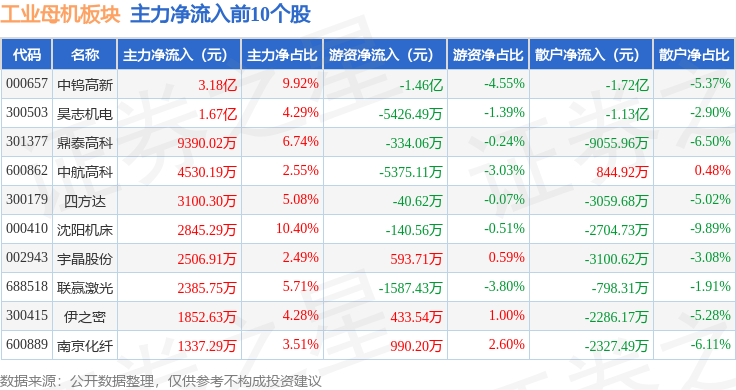 从资金流向上来看,当日工业母机板块主力资金净流出2568.15万元,游资资金净流出3.79亿元,散户资金净流入4.05亿元。工业母机板块个股资金流向见下表: