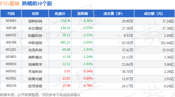 证券之星消息,1月6日F5G板块较上一交易日下跌2.36%,剑桥科技领跌。当日上证指数报收于4083.67,上涨1.5%。深证成指报收于14022.55,上涨1.4%。F5G板块个股涨跌见下表: