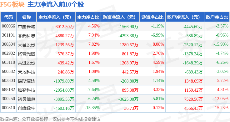 从资金流向上来看,当日F5G板块主力资金净流出45.44亿元,游资资金净流入30.82亿元,散户资金净流入14.62亿元。F5G板块个股资金流向见下表: