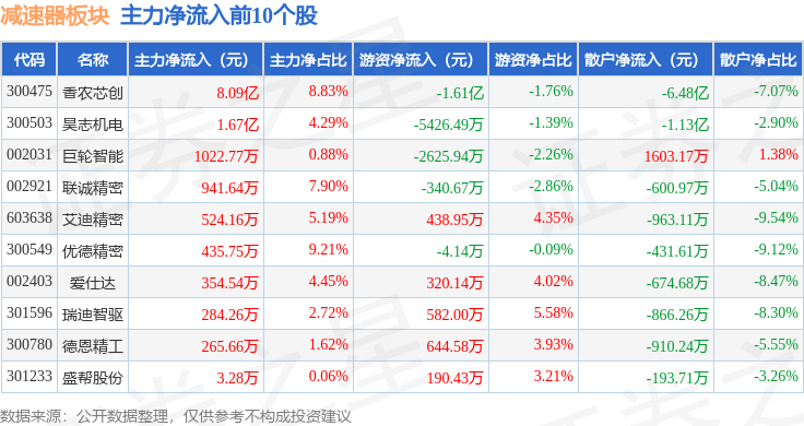 从资金流向上来看,当日减速器板块主力资金净流出3.49亿元,游资资金净流出4.28亿元,散户资金净流入7.77亿元。减速器板块个股资金流向见下表: