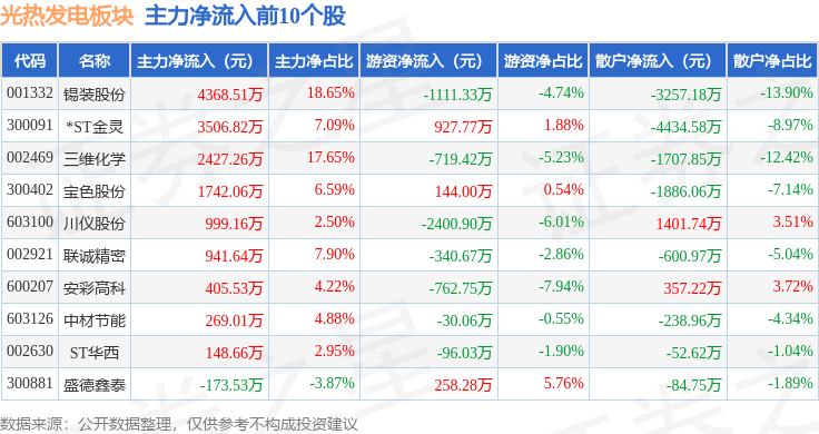从资金流向上来看,当日光热发电板块主力资金净流出3.86亿元,游资资金净流出1413.66万元,散户资金净流入4.0亿元。光热发电板块个股资金流向见下表: