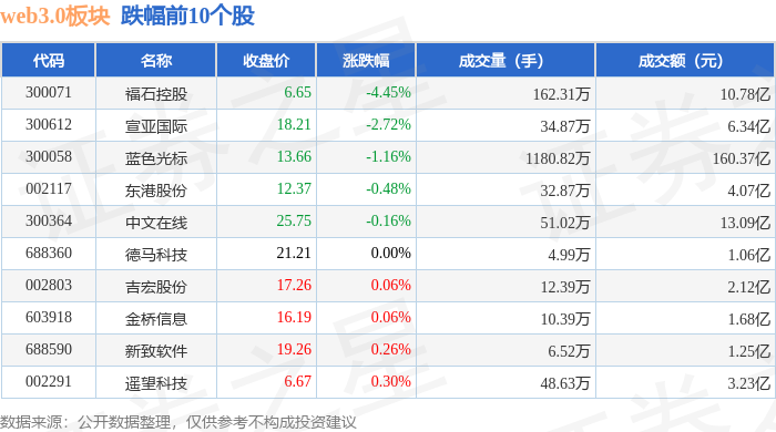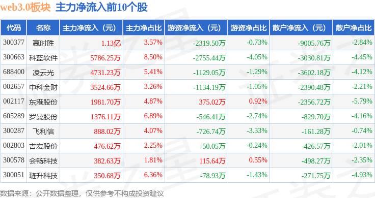 从资金流向上来看,当日web3.0板块主力资金净流出18.39亿元,游资资金净流入1.21亿元,散户资金净流入17.18亿元。web3.0板块个股资金流向见下表: