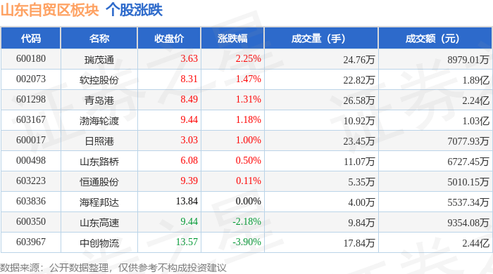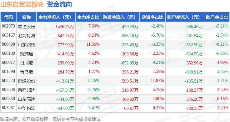 从资金流向上来看,当日山东自贸区板块主力资金净流入1618.34万元,游资资金净流出214.37万元,散户资金净流出1403.96万元。山东自贸区板块个股资金流向见下表: