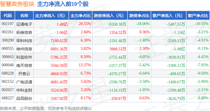 从资金流向上来看,当日智慧政务板块主力资金净流出32.02亿元,游资资金净流出3.91亿元,散户资金净流入35.92亿元。智慧政务板块个股资金流向见下表: