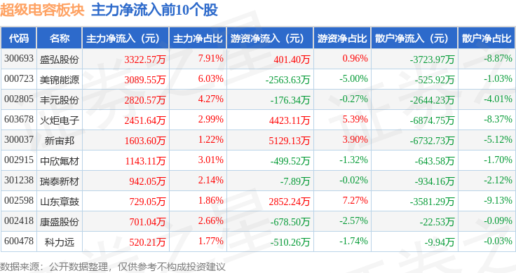 从资金流向上来看,当日超级电容板块主力资金净流出4.03亿元,游资资金净流入2.23亿元,散户资金净流入1.79亿元。超级电容板块个股资金流向见下表: