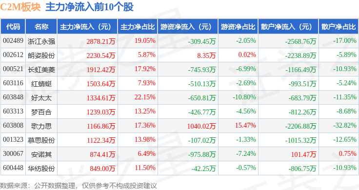 从资金流向上来看,当日C2M板块主力资金净流出8.09亿元,游资资金净流入1.31亿元,散户资金净流入6.78亿元。C2M板块个股资金流向见下表: