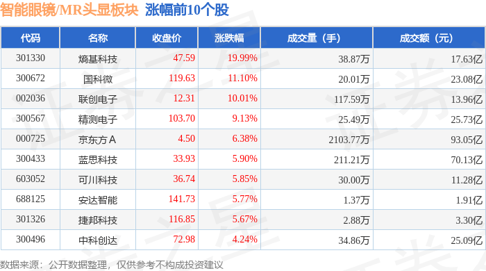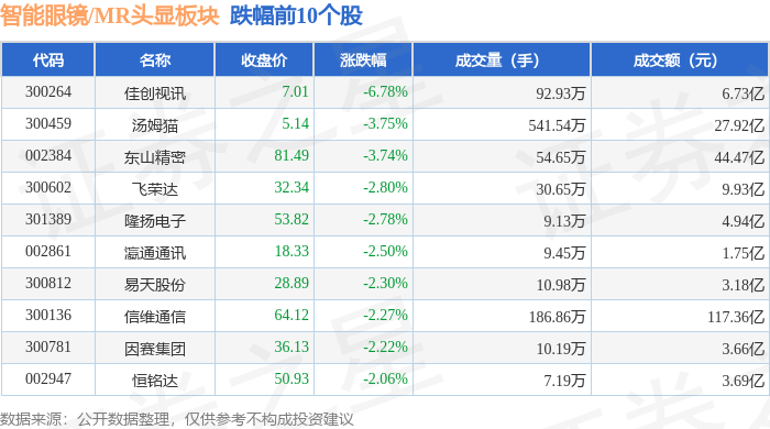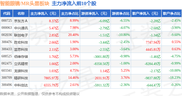 从资金流向上来看,当日智能眼镜/MR头显板块主力资金净流出11.18亿元,游资资金净流出8.86亿元,散户资金净流入20.04亿元。智能眼镜/MR头显板块个股资金流向见下表: