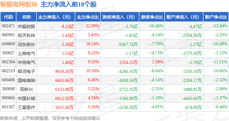 从资金流向上来看,当日智能电网板块主力资金净流出3.01亿元,游资资金净流出5.94亿元,散户资金净流入8.95亿元。智能电网板块个股资金流向见下表: