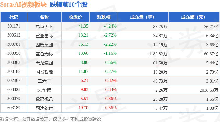 证券之星消息,1月6日Sora/AI视频板块较上一交易日上涨0.72%,电广传媒领涨。当日上证指数报收于4083.67,上涨1.5%。深证成指报收于14022.55,上涨1.4%。Sora/AI视频板块个股涨跌见下表: