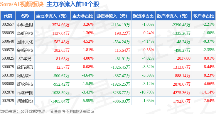 从资金流向上来看,当日Sora/AI视频板块主力资金净流出21.31亿元,游资资金净流入1.57亿元,散户资金净流入19.74亿元。Sora/AI视频板块个股资金流向见下表: