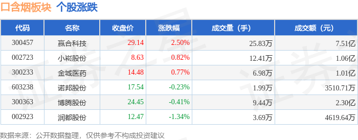 证券之星消息,1月6日口含烟板块较上一交易日上涨0.92%,赢合科技领涨。当日上证指数报收于4083.67,上涨1.5%。深证成指报收于14022.55,上涨1.4%。口含烟板块个股涨跌见下表: