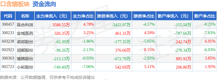 从资金流向上来看,当日口含烟板块主力资金净流入2788.63万元,游资资金净流出2902.51万元,散户资金净流入113.88万元。口含烟板块个股资金流向见下表: