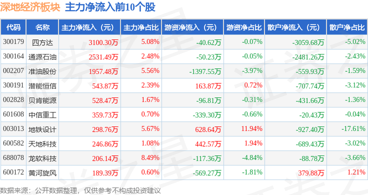 从资金流向上来看,当日深地经济板块主力资金净流出6606.42万元,游资资金净流出7956.03万元,散户资金净流入1.46亿元。深地经济板块个股资金流向见下表: