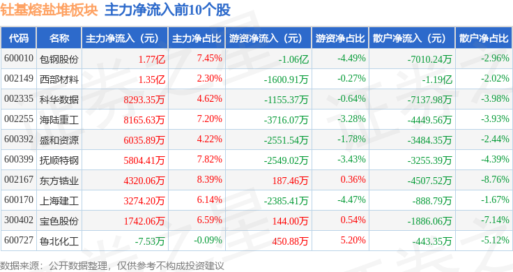 从资金流向上来看,当日钍基熔盐堆板块主力资金净流入3.17亿元,游资资金净流出3.0亿元,散户资金净流出1724.49万元。钍基熔盐堆板块个股资金流向见下表: