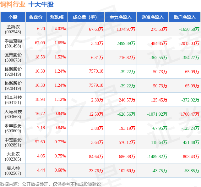 个股表现方面,饲料行业当日领涨股为金新农(002548),该股当日报收6.2,上涨4.03%,成交量67.63万,主力资金净流入1374.97万元。乖宝宠物(301498)以上涨1.65%紧随其后,该股当日成交量3.4万,主力资金净流出2499.89万元。除此之外,佩蒂股份(300673)、路斯股份(920419)、路斯股份(920419)均进入当日牛股之列。具体个股列表见下表: