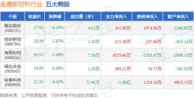 个股表现方面,金属新材料行业当日领跌股为隆达股份(688231),该股当日报收27.62,下跌4.43%,成交量9.61万,主力资金净流入311.89万元。悦安新材(688786)以下跌1.87%紧随其后,该股当日成交量2.45万,主力资金净流入215.3万元。除此之外,有研粉材(688456)、福达合金(603045)、安泰科技(000969)均进入当日熊股之列。具体个股列表见下表: