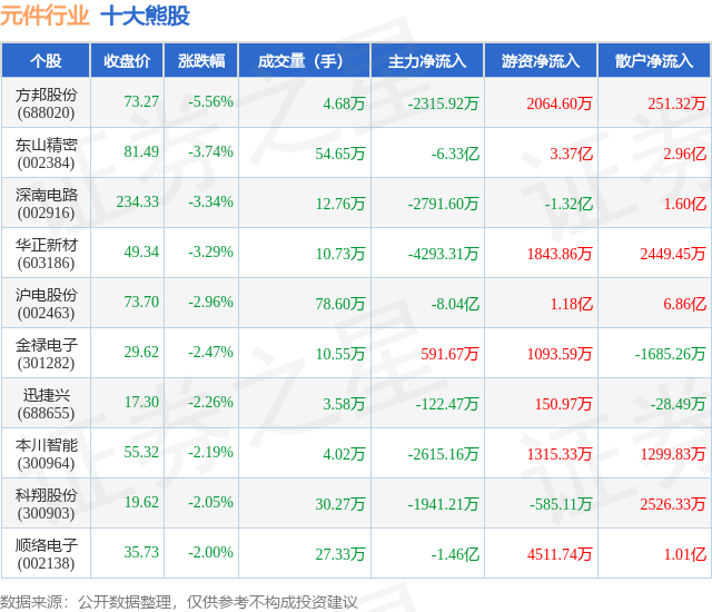 个股表现方面,元件行业当日领跌股为方邦股份(688020),该股当日报收73.27,下跌5.56%,成交量4.68万,主力资金净流出2315.92万元。东山精密(002384)以下跌3.74%紧随其后,该股当日成交量54.65万,主力资金净流出6.33亿元。除此之外,深南电路(002916)、华正新材(603186)、沪电股份(002463)均进入当日熊股之列。具体个股列表见下表: