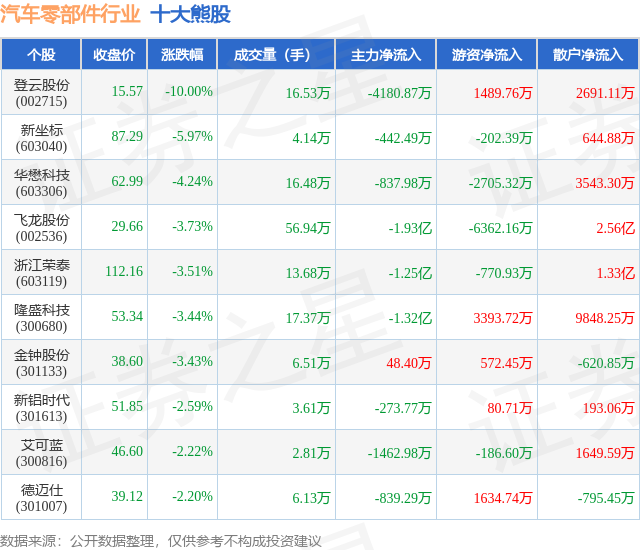 个股表现方面,汽车零部件行业当日领跌股为登云股份(002715),该股当日报收15.57,下跌10.0%,成交量16.53万,主力资金净流出4180.87万元。新坐标(603040)以下跌5.97%紧随其后,该股当日成交量4.14万,主力资金净流出442.49万元。除此之外,华懋科技(603306)、飞龙股份(002536)、浙江荣泰(603119)均进入当日熊股之列。具体个股列表见下表: