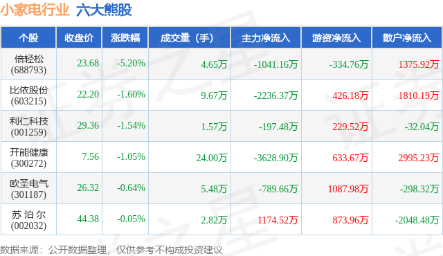 个股表现方面,小家电行业当日领跌股为倍轻松(688793),该股当日报收23.68,下跌5.2%,成交量4.65万,主力资金净流出1041.16万元。比依股份(603215)以下跌1.6%紧随其后,该股当日成交量9.67万,主力资金净流出2236.37万元。除此之外,利仁科技(001259)、开能健康(300272)、欧圣电气(301187)均进入当日熊股之列。具体个股列表见下表: