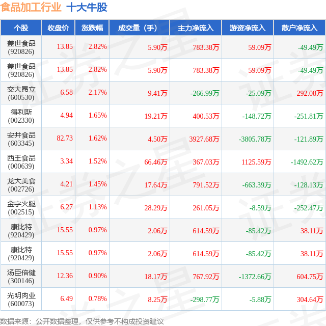 个股表现方面,食品加工行业当日领涨股为盖世食品(920826),该股当日报收13.85,上涨2.82%,成交量5.9万,主力资金净流入783.38万元。盖世食品(920826)以上涨2.82%紧随其后,该股当日成交量5.9万,主力资金净流入783.38万元。除此之外,交大昂立(600530)、得利斯(002330)、安井食品(603345)均进入当日牛股之列。具体个股列表见下表: