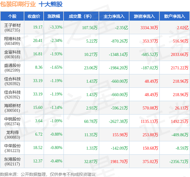 个股表现方面,包装印刷行业当日领跌股为王子新材(002735),该股当日报收19.17,下跌3.33%,成交量107.56万,主力资金净流出2.35亿元。翔港科技(603499)以下跌2.34%紧随其后,该股当日成交量5.22万,主力资金净流出870.26万元。除此之外,金富科技(003018)、盛通股份(002599)、佳合科技(920392)均进入当日熊股之列。具体个股列表见下表: