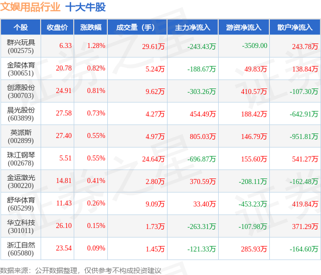 个股表现方面,文娱用品行业当日领涨股为群兴玩具(002575),该股当日报收6.33,上涨1.28%,成交量29.61万,主力资金净流出243.43万元。金陵体育(300651)以上涨0.82%紧随其后,该股当日成交量5.24万,主力资金净流出188.67万元。除此之外,创源股份(300703)、晨光股份(603899)、英派斯(002899)均进入当日牛股之列。具体个股列表见下表: