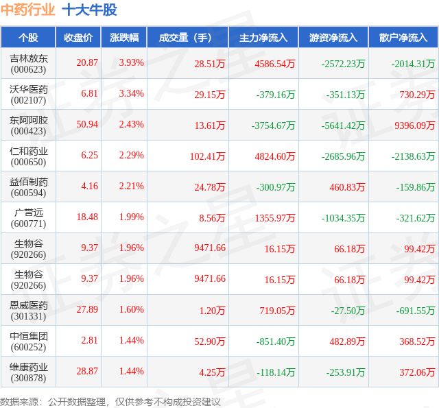 个股表现方面,中药行业当日领涨股为吉林敖东(000623),该股当日报收20.87,上涨3.93%,成交量28.51万,主力资金净流入4586.54万元。沃华医药(002107)以上涨3.34%紧随其后,该股当日成交量29.15万,主力资金净流出379.16万元。除此之外,东阿阿胶(000423)、仁和药业(000650)、益佰制药(600594)均进入当日牛股之列。具体个股列表见下表: