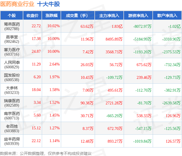 个股表现方面,医药商业行业当日领涨股为鹭燕医药(002788),该股当日报收22.72,上涨10.02%,成交量63.62万,主力资金净流入1.83亿元。嘉事堂(002462)以上涨10.0%紧随其后,该股当日成交量11.96万,主力资金净流入8495.89万元。除此之外,塞力医疗(603716)、人民同泰(600829)、国发股份(600538)均进入当日牛股之列。具体个股列表见下表: