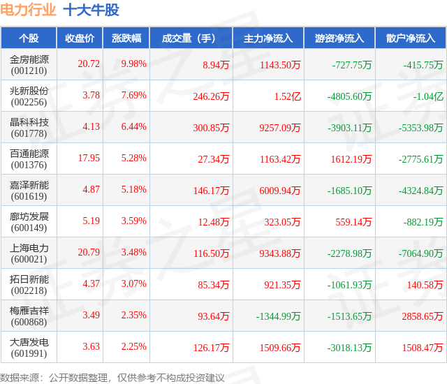 个股表现方面,电力行业当日领涨股为金房能源(001210),该股当日报收20.72,上涨9.98%,成交量8.94万,主力资金净流入1143.5万元。兆新股份(002256)以上涨7.69%紧随其后,该股当日成交量246.26万,主力资金净流入1.52亿元。除此之外,晶科科技(601778)、百通能源(001376)、嘉泽新能(601619)均进入当日牛股之列。具体个股列表见下表: