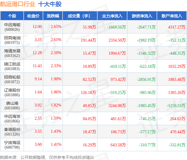 个股表现方面,航运港口行业当日领涨股为中远海能(600026),该股当日报收12.0,上涨2.65%,成交量51.98万,主力资金净流出1669.56万元。招商南油(601975)以上涨2.61%紧随其后,该股当日成交量191.44万,主力资金净流入2334.5万元。除此之外,海通发展(603162)、锦江航运(601083)、招商轮船(601872)均进入当日牛股之列。具体个股列表见下表: