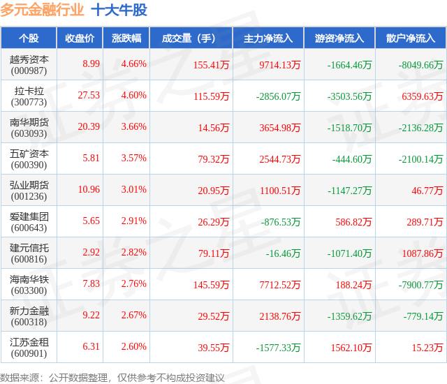 个股表现方面,多元金融行业当日领涨股为越秀资本(000987),该股当日报收8.99,上涨4.66%,成交量155.41万,主力资金净流入9714.13万元。拉卡拉(300773)以上涨4.6%紧随其后,该股当日成交量115.59万,主力资金净流出2856.07万元。除此之外,南华期货(603093)、五矿资本(600390)、弘业期货(001236)均进入当日牛股之列。具体个股列表见下表: